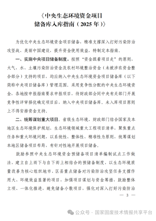 為深入貫徹黨中央、國務院有關決策部署,提高預算安排的科學性、規(guī)范性和前瞻性,進一步充分發(fā)揮中央生態(tài)環(huán)境資金項目儲備庫作用,對持續(xù)深入打好污染防治攻堅戰(zhàn)和推進美麗中國建設形成有力支撐,根據(jù)《生態(tài)環(huán)境領域中央和地方財政事權和支出責任劃分改革方案》《中央生態(tài)環(huán)保轉(zhuǎn)移支付資金項目儲備制度管理暫行辦法》《中央生態(tài)環(huán)境資金項目管理規(guī)程》以及生態(tài)環(huán)境資金管理辦法等有關文件,生態(tài)環(huán)境部、財政部修訂了《中央生態(tài)環(huán)境資金項目儲備庫入庫指南(2025年)》。(來源:農(nóng)村污水)